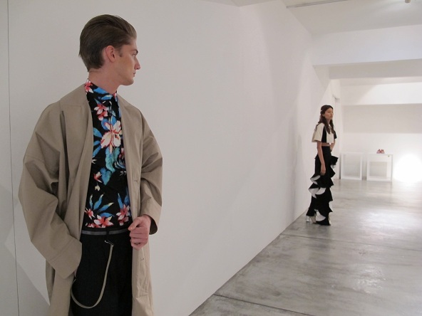 The < Japanese Icon> inspired by the late 70’s Japanese Male icon Ryuichi Sakamoto, is a wardrobe of elegance and refinement. The colourful and capacious overcoats, flower printed shirts and high-waisted trousers with tucked in sweaters are reminiscent of the biggest American idol to young Japanese adults, Elvis Presley. The unconventional proportions are discrete but complex, timeless classics that embody modern elements such as longer jackets, chests that are shortened and pleated pants.